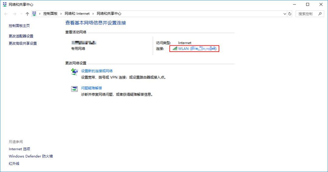 ③ 在“网络与共享中心”中可以看到这台电脑连接的WiFi,点击“连接”旁边的WiFi名称