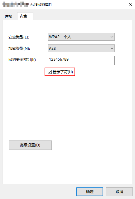 ⑤ 弹出该网络的无线网络属性后,点击第二项“安全”,然后勾选最后一个选项,显示“网络安全秘钥”字符,文本框中即是该WiFi的密码。