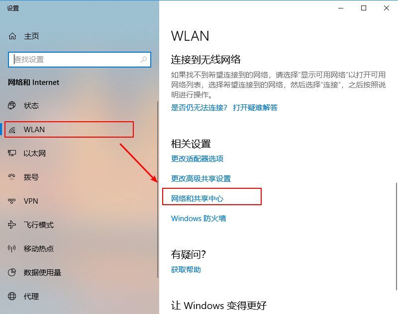 ② 返回主页,在设置中选择WLAN,并在相关设置中点击“网络和共享中心”