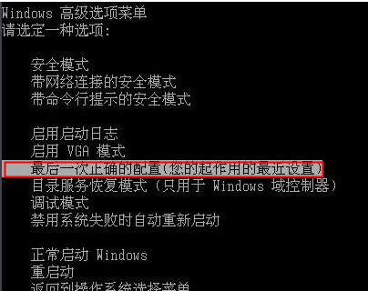 3、使用键盘下键,移动选项,选中“最后一次正确的配置”,按下回车键打开即可;