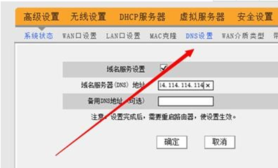 9、找到“高级设置”下方的“DNS设置”,同样的输入DNS地址114.114.114.114、114.114.115.115,点击确定进行保存。