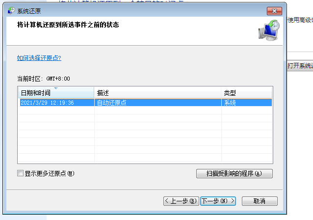 在系统还原点的选项中选择一个还原点,点击“下一步”。