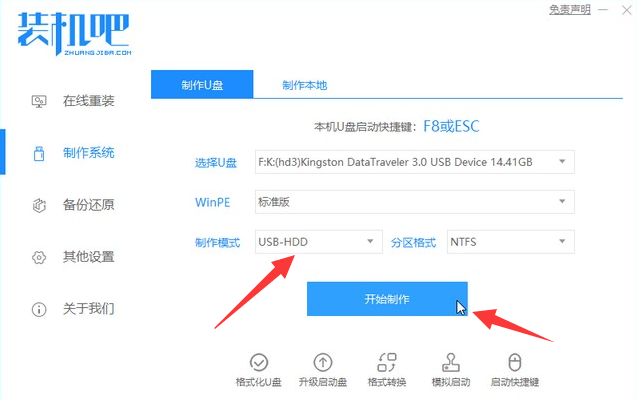 2,选到你的U盘,接着选择“USB-HDD”模式,点击“开始制作”进入下一步。