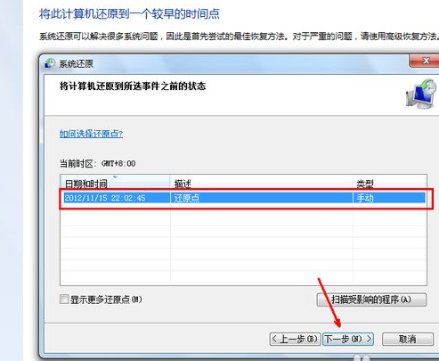 5、在系统还原点的选项当中,选择一个还原点,要确保所选择的还原点是之前系统正常时的还原点,因为如果是不正常的还原点则会出现问题。