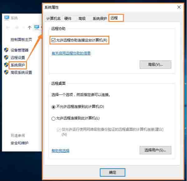 1、右键 此电脑 选择 属性 ,在点击 系统保护 -> 远程 -> 允许远程桌面 。如图所示: